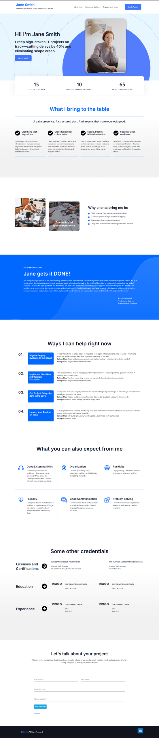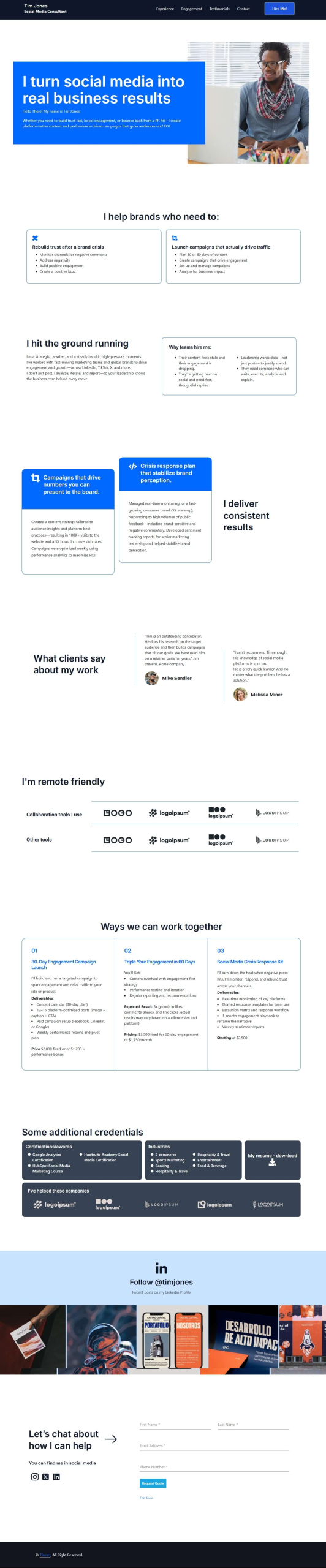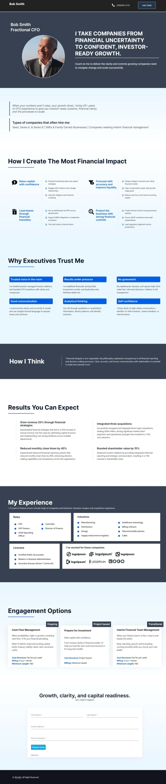 Not sure how to package your services? We are. Just send us your resume, LinkedIn, and answer some questions — we’ll build a referral-ready site that highlights your results, solves real client problems, and positions you with three clear offers designed to win work fast. Get started by selecting a template below.